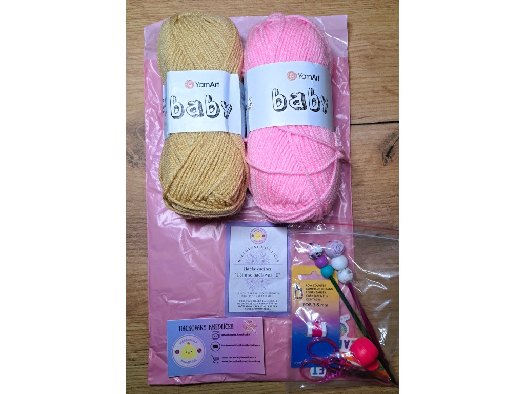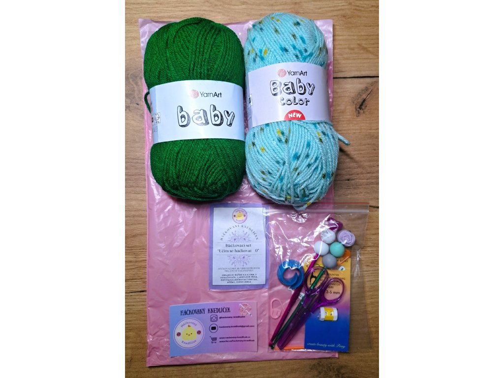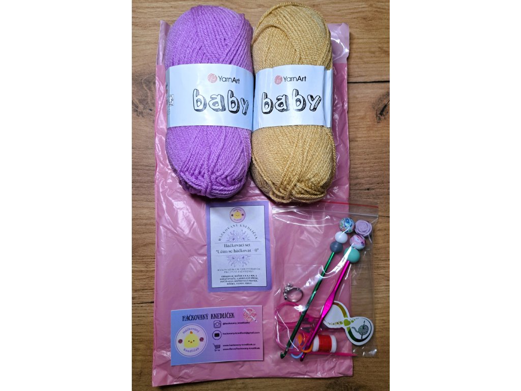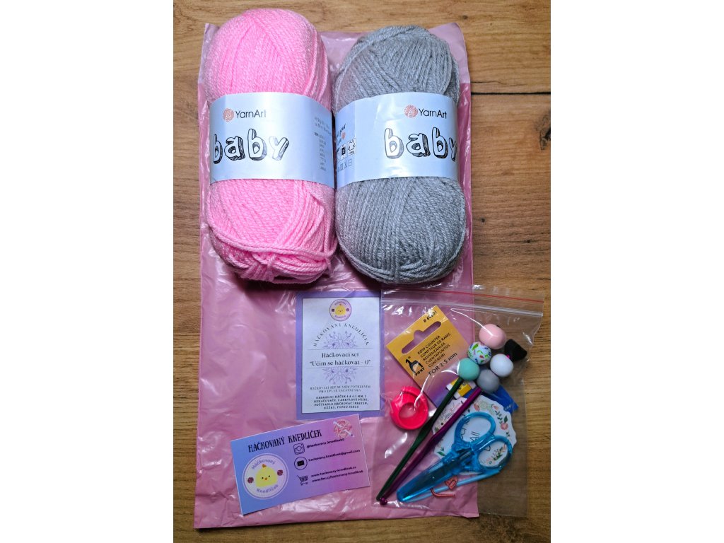 Háčkovací set “Učím se háčkovat - 0” – set obsahuje krásné háčky 4 a 4,5 mm ozdobené silikonovými korálky, 2 akrylové příze (každá 50 g), 2 označovače, tupou jehlu, počítadlo, háčkovací prsten a nůžky.
