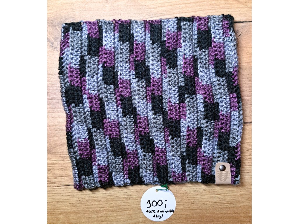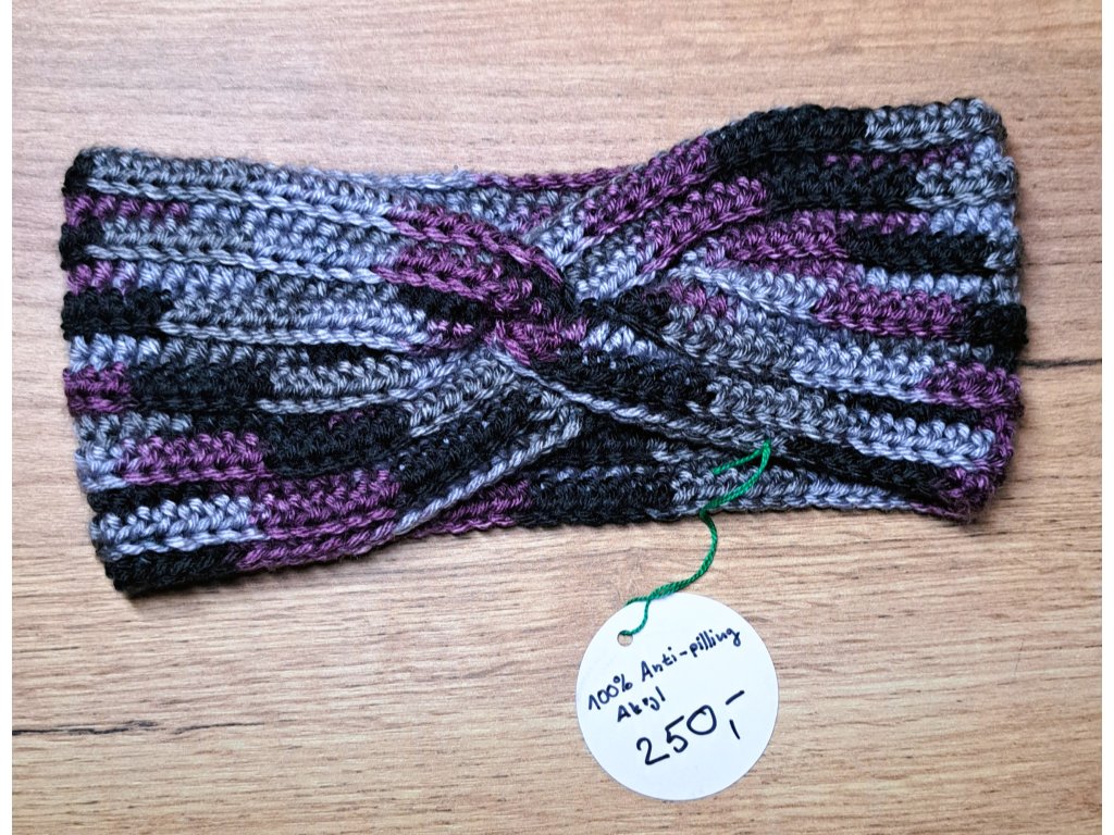 Šedo-černo-fialová čelenka a nákrčník - příze Himalaya everyday ekose (100% anti-pilling akryl) - certifikovaná příze pro citlivou pokožku, velmi příjemná na dotyk a nežmolkuje!